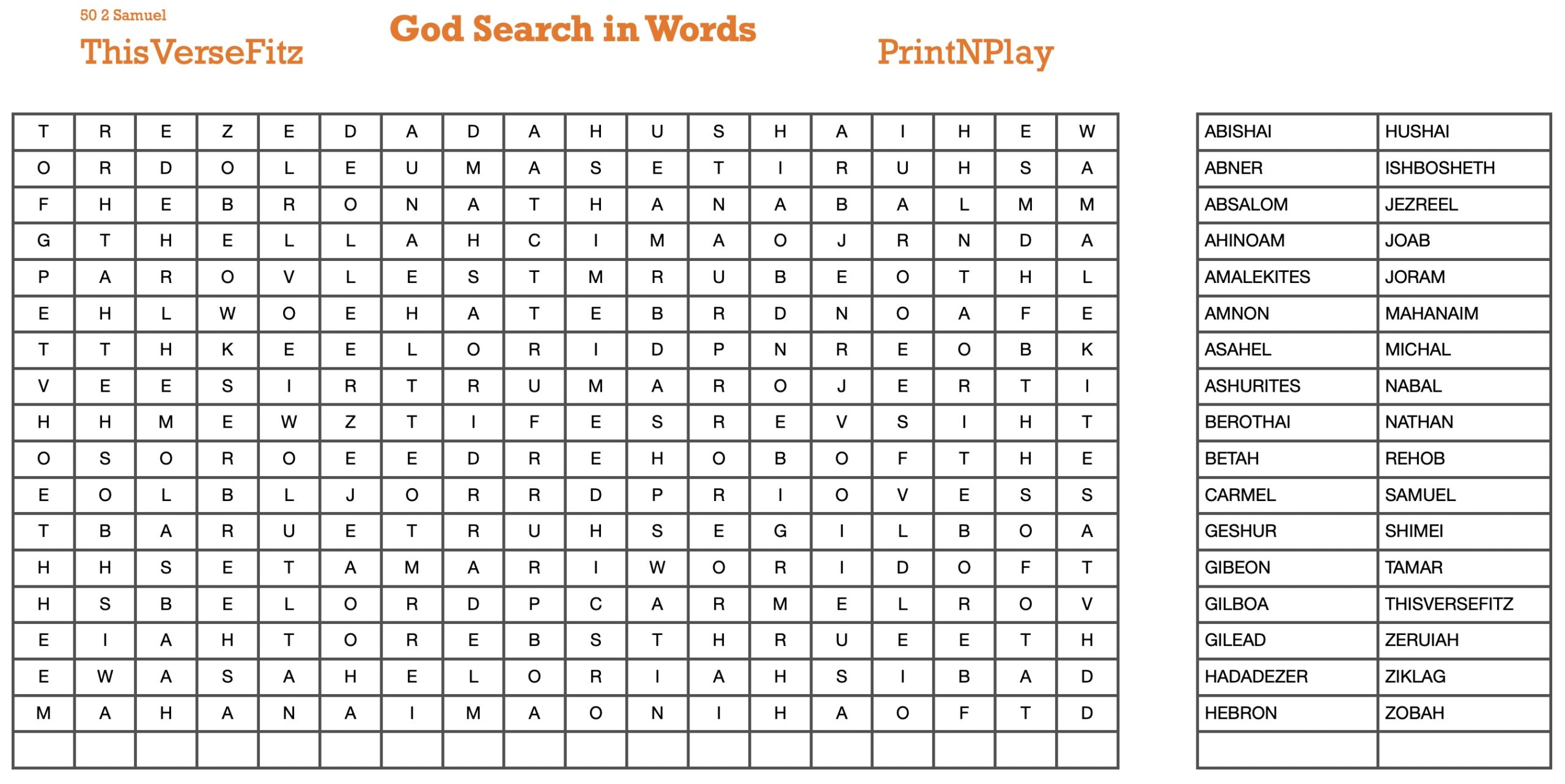“God Search in Words” works exactly as a normal “Word Search” with a somewhat higher level of difficulty given the Biblical terms. Once all the words are found, the leftover letters repeat a phrase 4.10 times (meaning the phrase is present 4 times and 10 letters of the phrase are left over). We call this the “AfterPuzzle”.